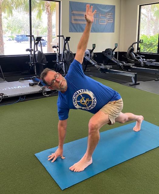 In the second photo, I’m in a lunge twist – working to keep my front foot fully on the ground and my back foot facing forward with my heel off the ground. But if I were doing this movement moving forward across the floor, I’d likely be wearing shoes.