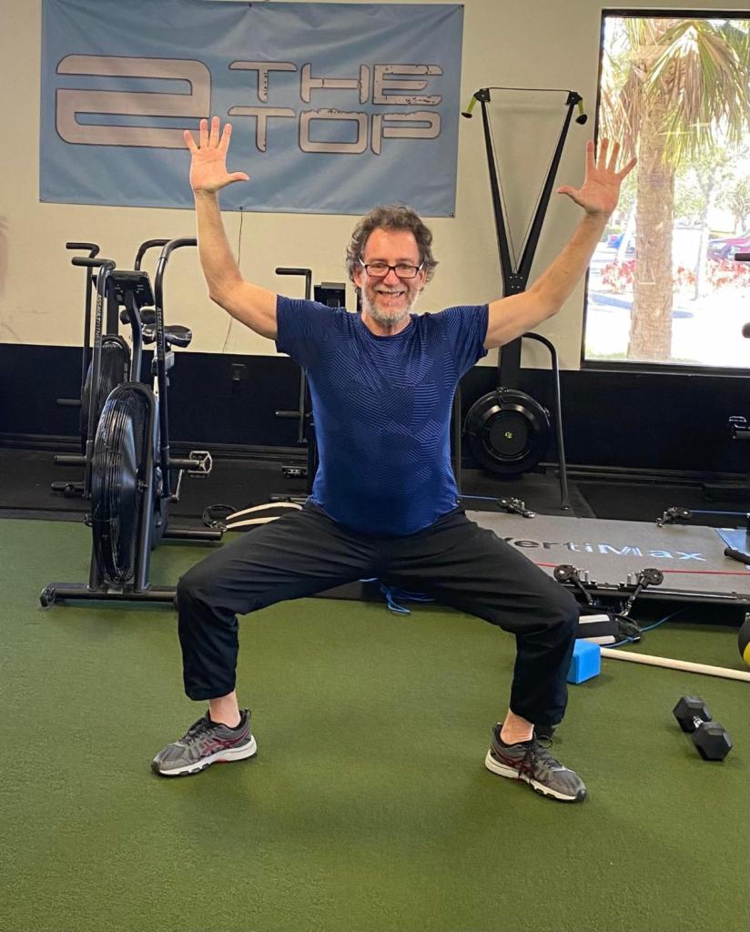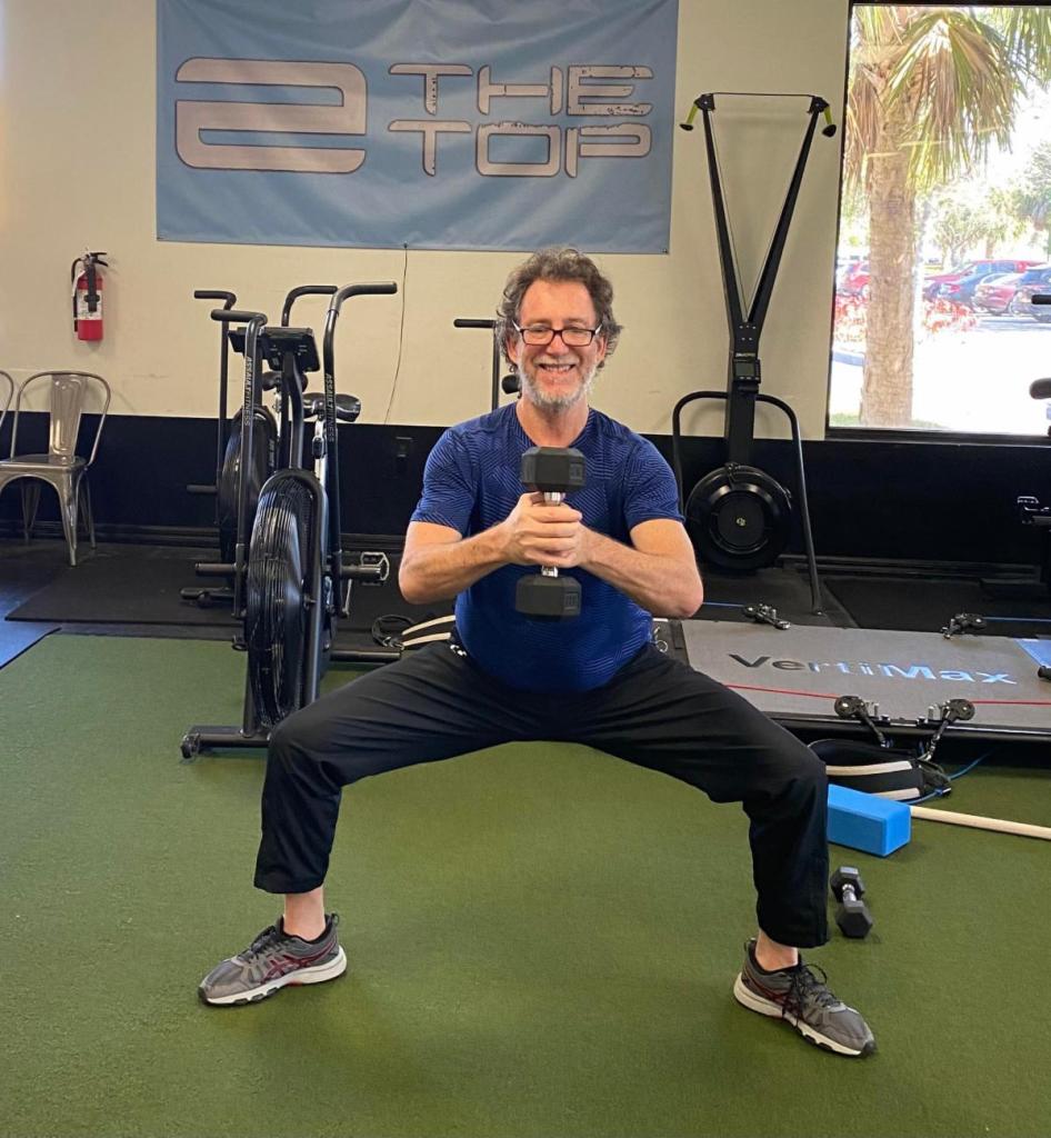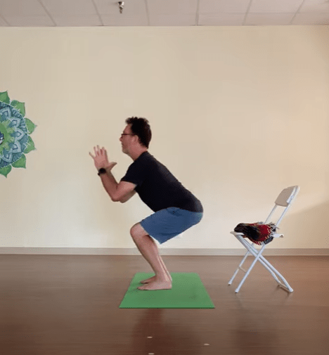 In the photo in which I’m squatting toward a chair, I’m doing a traditional body-weight squat. Now, the main reason we want to be able to do squats is so we can get up and down from chairs and couches without having to use our hands. (Try sitting down in a chair and then standing back up hands-free – that’s why we squat. If that’s easy, hold onto a weight while you do multiple repetitions.)