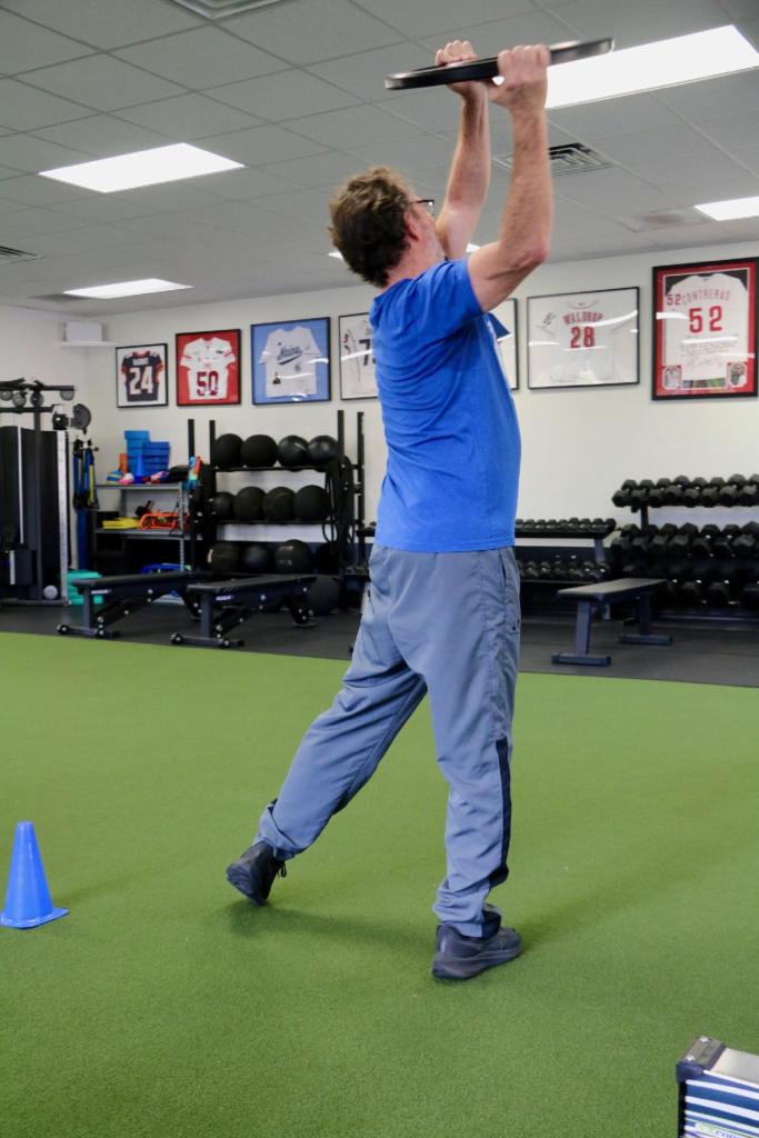 I’ll add that another personal dislike of mine is core work lying on the back, but I don’t know how necessary it is. There are reasons why I still do it myself and have others do it, though. I prefer for core work to be more functional, and fun. In the photo, I’m swinging a plate on a diagonal (don’t let go!). It’s an athletic movement that also comes in handy when lifting and reaching, and you can add some single-leg balance as well.