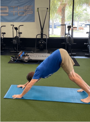 I’ve been teaching a Sunday morning yoga class at 2 The Top, and each class has a theme. Guess what this Sunday’s theme is? You got it – sun salutations! The downward dog I’m pictured doing here is a key part of the sun salutation. I’d love to hear what challenge ideas you come up with, and of course I’d love to see you at 2 The Top for yoga or a workout!